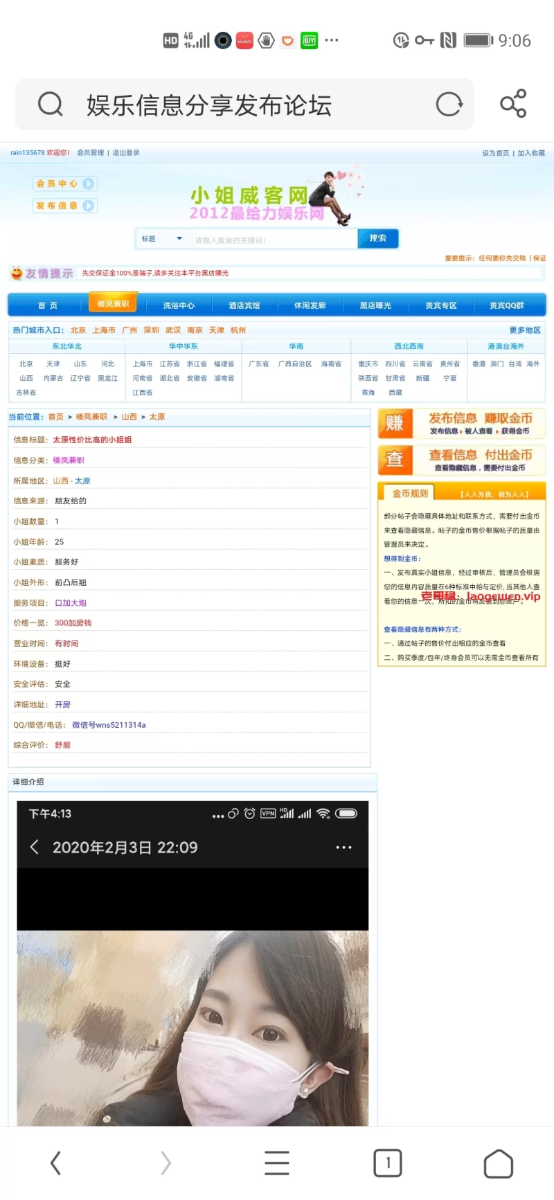 信息分类:楼凤兼职 地区:山西-太原 信息来源:网上找的 小姐数量:1 小姐年龄:26 小姐素质:差 小姐外形:差 服务项目:差 价格:200 400 营业时间:1 环境设备:1 安全评估:不是很安全 详细地址:本段信息已隐藏,请先登陆。点击登陆 , 或者 点击注册 联系方式:本段信息已隐藏,请先登陆。点击登陆 , 或者 点击注册 综合评价:太丑 详细介绍: 本人根本就不是这个样,完全相反 楼凤兼职