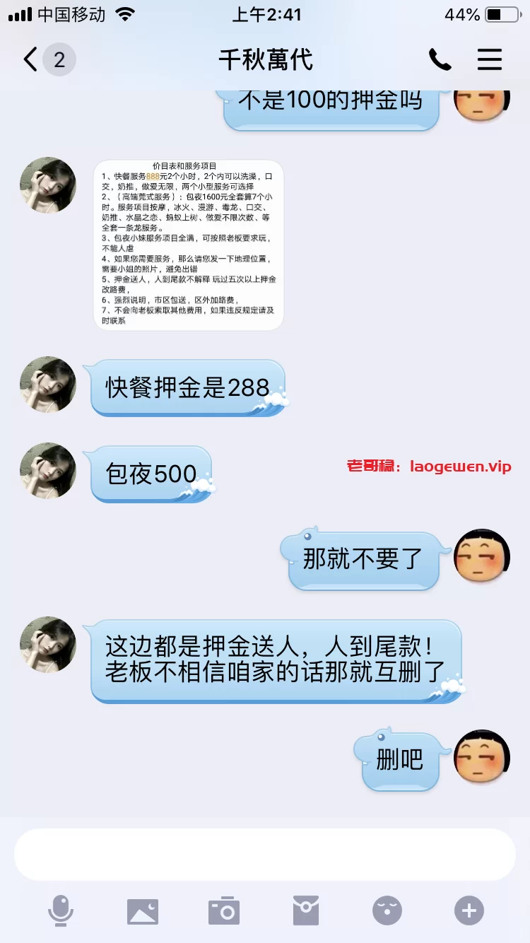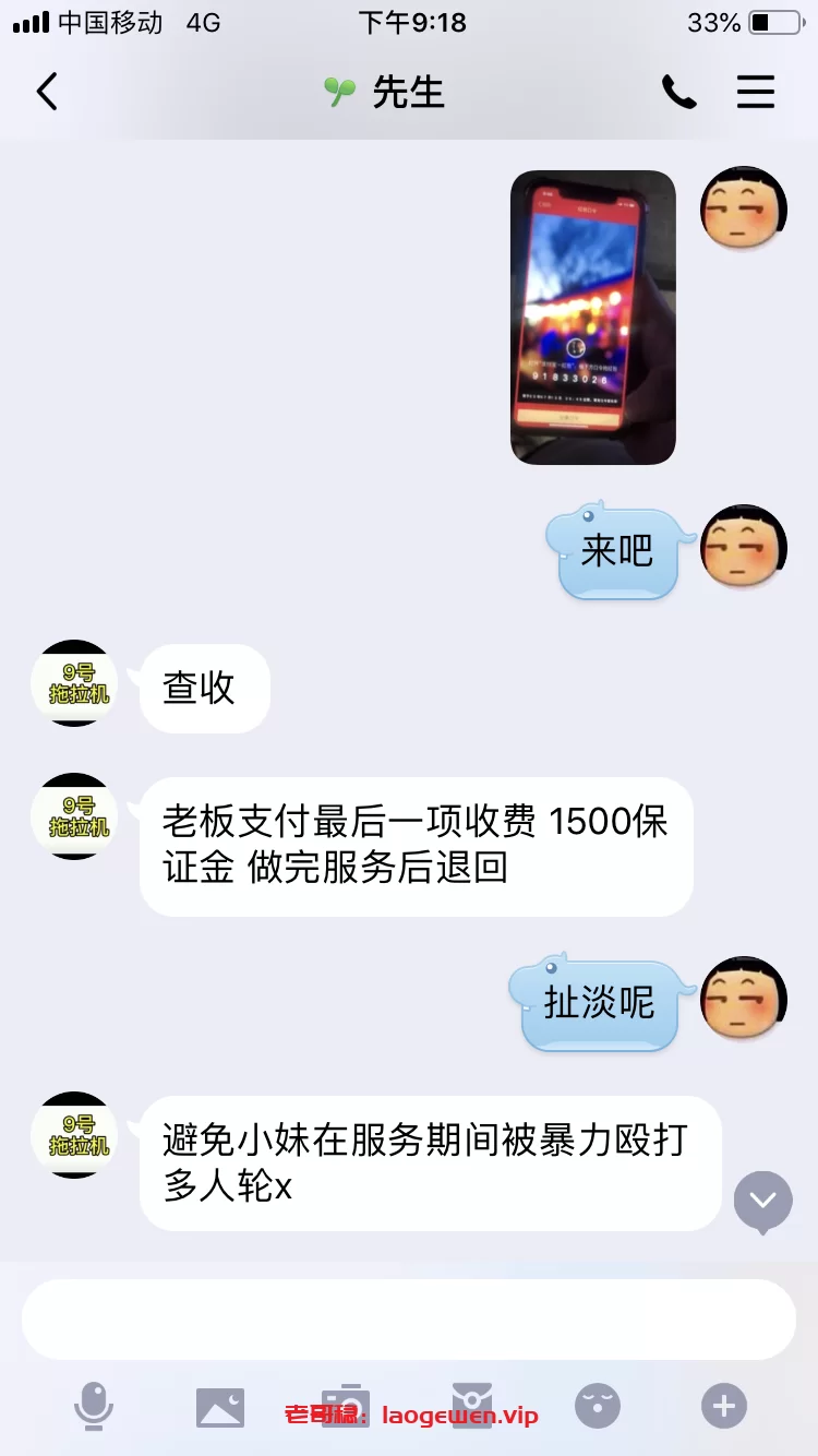 首先,事情起因是朋友要到宿迁来玩,让我找找资源,我从宿迁贴吧里翻到俩个号称玩过有资源的“老司机”,通过私信加上Q(QQ1714432092/QQ2232212641),然后各发了个烟钱求分享联系,各推送后QQ(QQ2020253640/QQ3173506500)加上,联系第一个从报价到选人都没有问题,最后说要给押金我果断拒绝拉黑,可是朋友不死心,不相信我,我就配合他让他买个教育…联系第二个人,报价选人也是没有问题,同样的最后要押金,朋友选择快餐押金288,人到付剩余,毫无破绽,20分钟后说人到楼下,要付尾款,朋友傻兮兮的付了尾款,然后对方又要求付1500保证金,朋友才意识到被骗,才放弃。(以此列警各狼友押金都是骗子)