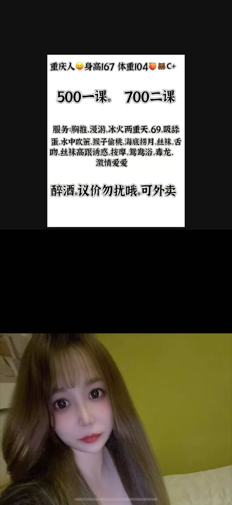 端午晚上寂寞难耐,就出去看看,在店子里面没有找到喜欢的 无聊网上微信加了一个妹子 就过去看了看 妹子80分吧(灯光有点暗)。前面聊得时候没有问细节 见了面才知道包夜好只能两次 就没有去玩 狼友没谨慎点哈 安不安全我都不晓得